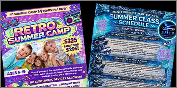 Cummings Martial Arts offers a wide variety of Summer Classes and Camps, starting in June 2026. These classes include our popular "Retro" Camp (with no electronic devices allowed), beginner to advanced Kempo Karate classes, Little Ninjas, MMA Fitness classes (registration coming soon) and Ladies' Self Defense classes. These classes always fill up quickly so act now! Click HERE to register, or contact us for more information.